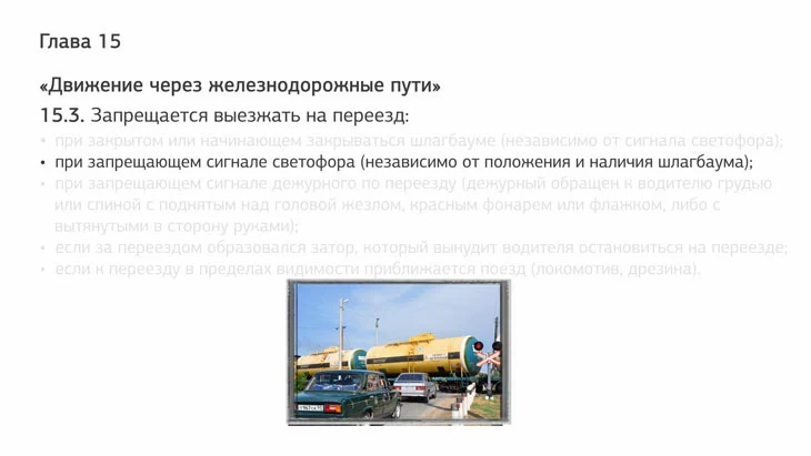 В конце урока поговорим об ответственности за те или иные нарушения правил проезда железнодорожных переездов, таких как выезд на переезд когда это запрещено, пересечение путей вне переезда, остановка или стоянка на переезде, обгон или объезд перед переездом и другие.