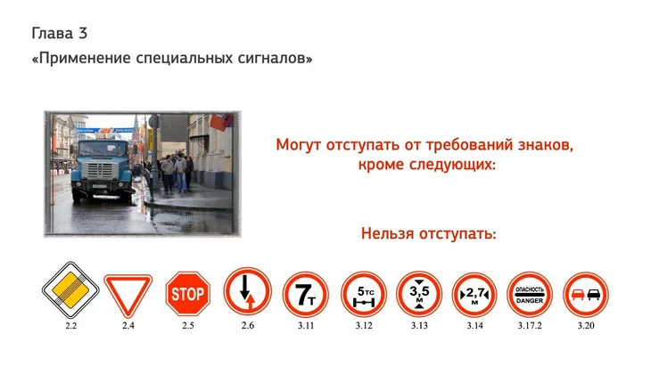 Узнаем, обгон, каких автомобилей запрещен, а также, каким мы должны уступать дорогу. Рассмотрим, от требований, каких пунктов правил разрешено отступать автомобилям с включенными специальными световыми сигналами.