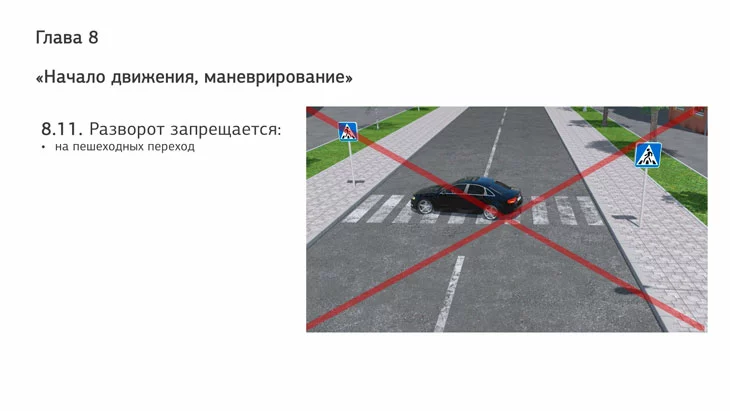 Затем, с использованием схем, рассмотрим, где запрещается выполнять разворот и движение задним ходом.