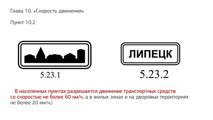 Далее, на наглядных графических объектах рассмотрим существующие строгие ограничения максимальной скорости в различных условиях.